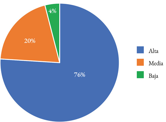 Además de la visión general, se midió este indicador con los siguientes subindicadores: rutas de aprendizaje (guías de trabajo), actividades de aprendizaje (evaluación), recursos de aprendizaje (videos, lecturas, presentaciones, juegos, entre otros), diseño instruccional (diseño del aula virtual), contenidos del curso y tiempo requerido. A partir de estos subindicadores, la mayor parte de la muestra afirmó tener una alta satisfacción en la calidad pedagógica del MOOC. La figura 1 muestra la satisfacción del estudiantado en cuanto a la calidad pedagógica por rangos, donde se toma en cuenta los indicadores anteriores.
