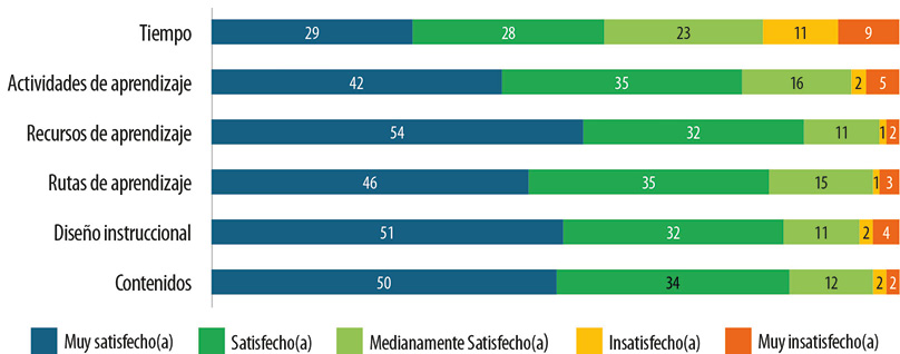 Los datos anteriores explican por qué el curso cuenta con una alta satisfacción. Al existir una interacción indirecta con la persona docente en la modalidad MOOC, los recursos, las actividades, las rutas de aprendizaje y el diseño instruccional son sumamente importantes, ya que son la guía del estudiante para construir sus aprendizajes y relacionarlos significativamente con su vida cotidiana para garantizar su aplicación (Roig et al., 2014).