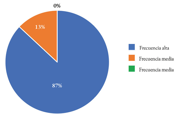 Entre los principales resultados del inventario mencionado, los datos finales indicaron que la mayoría de la muestra (87%) se posicionó en una frecuencia alta en la aplicación de hábitos relacionados con los pilares de la organización del tiempo. La figura 3 muestra los rangos del inventario final Hábitos de organización del tiempo.