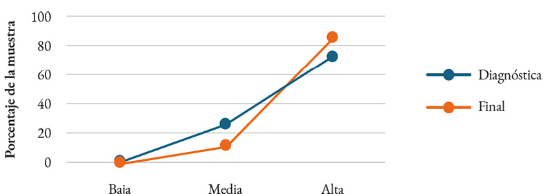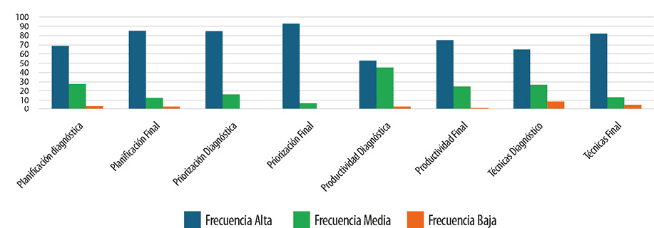 Al analizar los datos del gráfico 5, se denota que en general, tanto en el momento diagnóstico como final, la tendencia del estudiantado estaba dirigida a una aplicación de frecuencia de hábitos de organización del tiempo; sin embargo, es claro el crecimiento en la aplicación final del inventario, donde el rango de frecuencia media baja y aumenta considerablemente el porcentaje de personas ubicadas en el rango de frecuencia alta. Cabe resaltar que se encontró una diferencia significativa en las puntuaciones entre los resultados del diagnóstico (M=37,51, SD=7,58) y los resultados finales (M=41,22, SD=6,43), siendo significativamente mayor el promedio de los resultados finales, lo cual se repitió en todos los indicadores. La figura 6 muestra los resultados por indicador, donde se compara el diagnóstico con la aplicación final.
