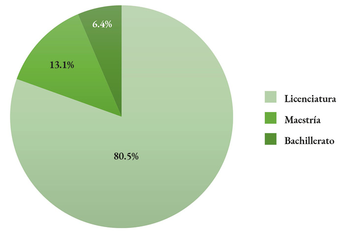 La selección muestral se lleva a cabo a través de un proceso probabilístico simple (Hernández-Sampieri y Mendoza, 2018). En cuanto al cálculo de esta, se obtiene a través de la fórmula para poblaciones finitas (Arnal et al., 1992). La muestra final es de n=328, valor superior al obtenido de la ecuación (n=315), teniendo en cuenta una población N=1753, un error de muestreo del 5%, un nivel de confianza del 95% y una distribución esperada del 50%. Se obtiene un valor de 315 y la muestra final queda compuesta por n=328, valor superior al obtenido en la formulación, aspecto que garantiza la representatividad de los datos. La muestra quedó compuesta por 278 mujeres (84.5%) y 51 hombres (15.5%). El rango de edad oscila desde los 22 a los 64 años (Media=40.8, DS=9.1, Mo=38). En la figura 1 se visualiza el grado académico de la muestra, donde el 80.5% posee licenciatura, un 13.1% maestría y el restante, un 6.4%, el nivel de bachillerato.
