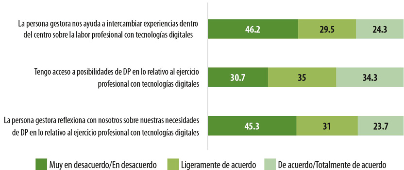 En relación con el apoyo recibido para el desarrollo profesional por parte de la gestión del centro, cabe destacar (figura 2) que el colectivo orientador indica estar muy en desacuerdo o desacuerdo (46,2%) con este, concretamente con el intercambio de experiencias relacionadas al uso de tecnología digital para la labor orientadora. Al respecto un 29.5% indica que está ligeramente de acuerdo y el restante, un 24.3%, está en desacuerdo o muy en desacuerdo. Datos similares se obtienen en torno al acceso a desarrollo profesional acerca de la tecnología, donde un 30.7% está muy de acuerdo o de acuerdo, un 35% ligeramente de acuerdo y un 34.3% en desacuerdo o muy en desacuerdo. Por último, un 45.3% considera que la dirección del centro educativo no reflexiona con las personas profesionales en Orientación sobre sus necesidades de desarrollo profesional con tecnología, un 31% ligeramente y un 23.7% indica estar muy en desacuerdo o desacuerdo.