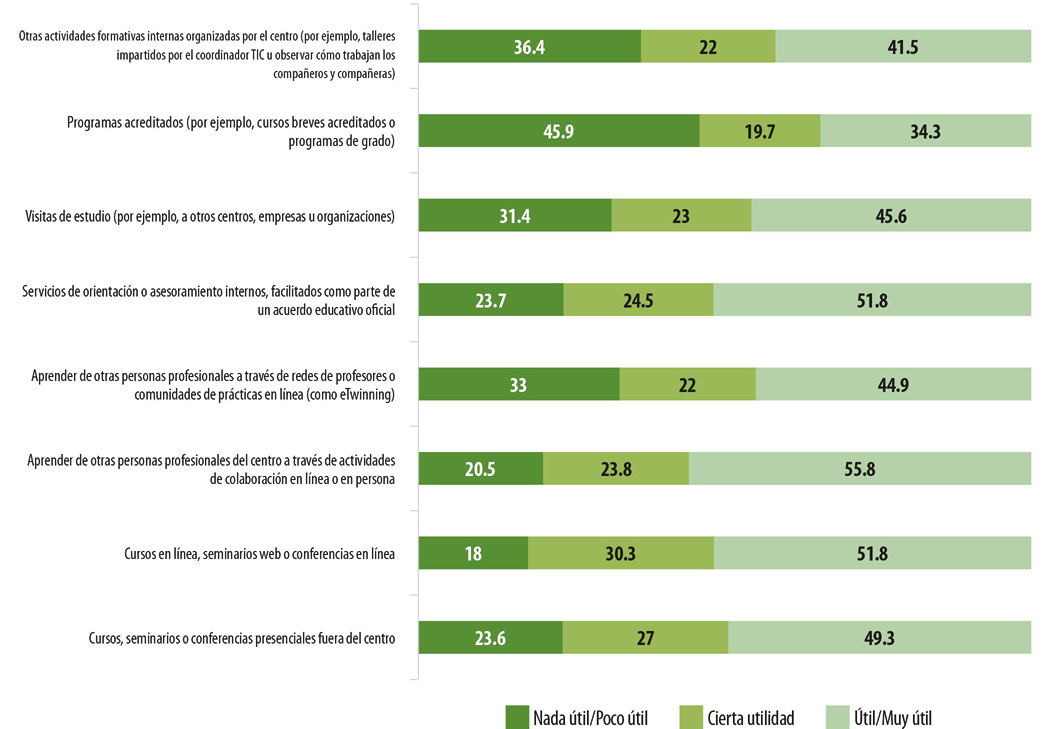 La utilidad de la formación recibida se refiere a la percepción de las personas profesionales acerca de la relevancia y aplicabilidad de la formación en TIC que han recibido. Según García-Martínez et al. (2020), la formación profesional debe considerar no solo el conocimiento adquirido, sino también cómo éste se traduce en prácticas efectivas y beneficios tangibles para la comunidad educativa en general. En el contexto de la Orientación, esto implica que la formación en TIC debe ser práctica, relevante y alineada con las necesidades específicas del colectivo de profesionales y sus estudiantes. (Muñoz-Carril y González-Sanmamed, 2015)