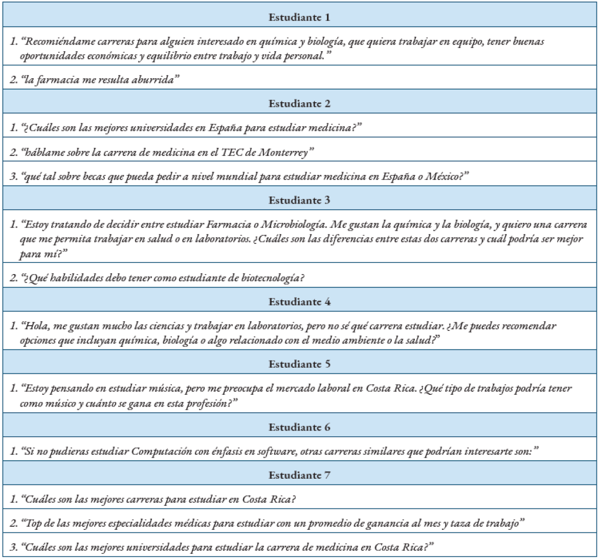 Por otra parte, algunos prompts reflejan interés en explorar más las opciones educativas disponibles, incluyendo universidades, carreras específicas y becas, tanto a nivel local como internacional. Dichos prompts están presentes en la tabla 1, cuando el estudiante 2 pregunta: “¿Cuáles son las mejores universidades en España para estudiar medicina?”, “¿Qué tal sobre becas que pueda pedir a nivel mundial para estudiar medicina en España o México?” y, el estudiante 6, “Si no pudieras estudiar Computación con énfasis en software, otras carreras similares que podrían interesarte son...” Asimismo, cuando el estudiante 7 señala: “¿Cuáles son las mejores universidades para estudiar la carrera de medicina en Costa Rica?”
