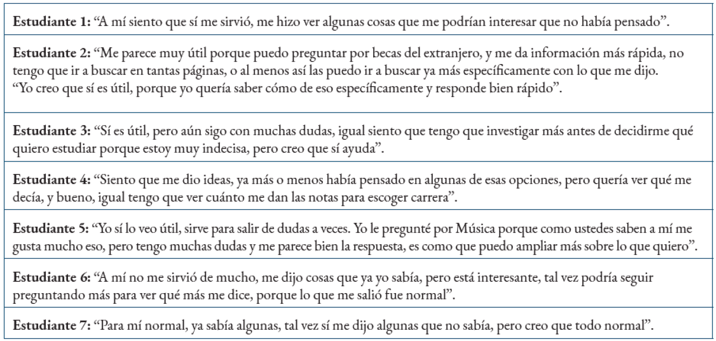 En una sesión de orientación colectiva se sistematizó el uso de la herramienta ChatGPT, como parte de la integración de herramientas tecnológicas que surgen de la inteligencia artificial y se integran en la cotidianeidad de los sistemas educativos. Dicha sistematización se realizó el martes 27 de agosto de 2024, a las 9:00 de la mañana, dentro del proceso de exploración vocacional para la toma de decisiones vocacionales durante una clase de Orientación con 21 personas estudiantes matriculadas y todas presentes, del 11.° año del Colegio Científico Costarricense de Puntarenas (CCCP). Se sistematizó una muestra de siete personas estudiantes que manifestaron anuencia para brindar los datos de su participación, con la particularidad de ser un estudiantado próximo a egresarse del último ciclo de secundaria costarricense y finiquitar su proceso de admisión a la educación superior, a partir del enunciado: Respecto al proceso para la elección de carrera vivenciado hasta a la fecha, ¿qué temas le gustaría ahondar chateando con la herramienta de IA, ChatGPT, para su toma de decisiones vocacionales?
